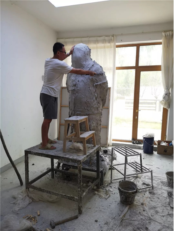 当一个艺术工作者进行人物创作时,或多或少地都会加入一些个人风格化的东西,但此次为薰琹先生塑像,我深知无论对这件作品加入何种主观意象,于历史而言,于庞先生而言,都是片面的,都是不够客观的。因此,我只有忘却自我,完全融于庞先生的精神世界,思他之所思,痛他之所痛。很遗憾作为后辈的我,没有与先生生于同一时代,未能见过先生的容颜,感受过先生的气质,我亦只能通过大量搜集庞先生的影像资料,反复研读先生的作品和传记,尽可能地与先生融为一体,讲述自己。