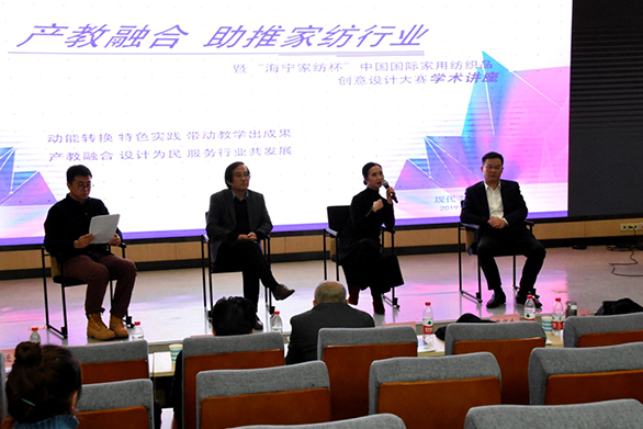赵进致欢迎词对各位领导、嘉宾、行业精英以及来自各院校师生参与此次活动表示感谢,介绍了现代手工艺术学院相关学术成果;魏启雄介绍了“海宁家纺杯”大赛十七年来的改革发展与所取得的成绩;徐行健针对现阶段设计界相关问题进行了剖析;贾京生以《海宁家纺杯•中国国际家用纺织品创意设计大赛主题解读与获奖解析》为题做专题讲座;刘晓萍以《格纹•品牌•趋势》为题做专题讲座;曹咬强介绍了海宁纺织产业的发展现状,提出地缘优势、产业链发展以及创意设计是海宁纺织业的发展优势以及大赛相关情况。