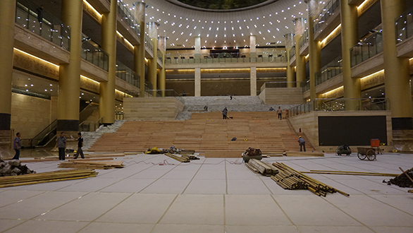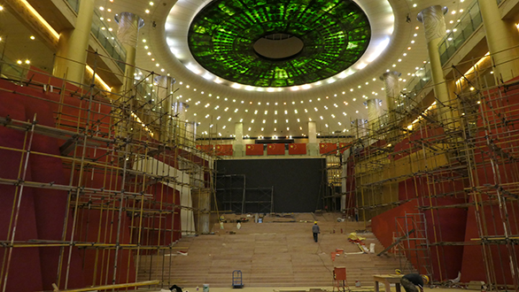 本次展览最大的亮点之一是气势磅礴的主题大厅。在施工设计方面,主题大厅的台阶呈阶梯状上升,搭建脚架难以固定,给施工带来很大挑战。如何将设计主题与场地完美结合,成为设计施工现场遇到的一大难题。设计施工团队将山东历史文化特色与场馆场地特点相结合,提出了“国泰民安”的设计创意,加之梦幻的灯光装置,将整个展览大厅营造为独具特色的主题秀。“国泰民安”造型原型为泰山,主体构造拾级而上,象征泰山十八盘,展现出山东人民奋发向上、攻坚克难、勇做新时代泰山“挑山工”的精神风貌;台阶顶端设置巨幅显示屏,循环播放国旗画面和展现齐鲁风光的巨幅画卷。
