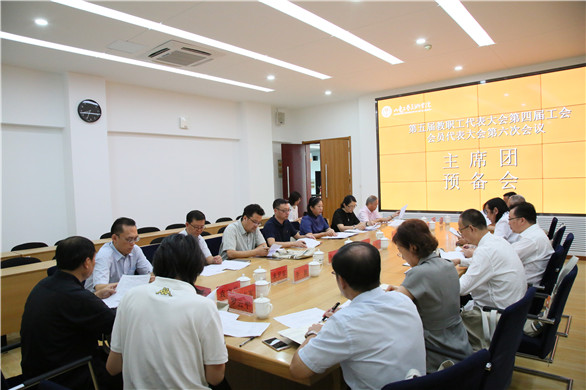 8月30日上午, 304am永利集团官网第五届教职工代表大会第四届工会会员代表大会第六次会议主席团预备会议在长清校区召开。校领导何思清、潘鲁生、苗登宇、李新、苗新民、董占军、韩世春出席会议。潘鲁生主持会议。