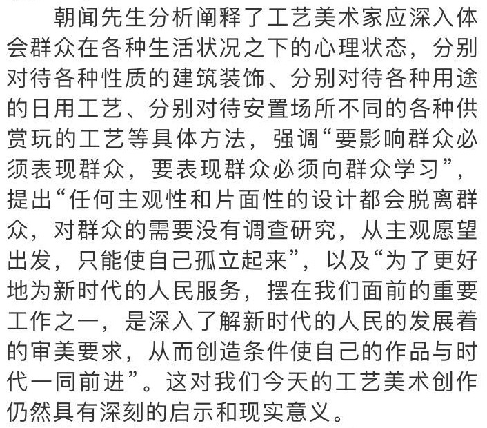 正是以积极的教育和影响作用为主导,对于工艺美术创作,朝闻先生也首先分析了其意识形态性,强调具有时代内容和发挥精神上的积极影响。朝闻先生指出:“人们观赏工艺品的目的,很难说是为了接受美育。但是,既然工艺品是一种物质生产也是一种精神生产,它在人们精神上也有积极影响。人们常说‘难能可贵’,‘巧夺天工’;在这方面历代民间艺术家的劳动提供了可贵的成果。北京等地目前出产的23层的象牙球,其目的不过是供认观赏,并不是企图用它来教诲人的;但它那精到的技艺,也能使人感到牙雕艺人的智慧、耐性、勤劳、细心和勇气,是对于劳动的才能和创造性的肯定。”〔5〕在对工艺样态与精神渊源及其作用的分析中,朝闻先生指出:“一件显示了工艺美术卓越成就的漆盆,玄色而发光的盆底上,有用漆堆成的浮雕式的一条金鱼,另外配上通草作的水仙和几块鹅卵石;根本没有水。我家小孩却对我说,‘水里有一条鱼’。利用了各种东西的适当配合而使人感到不存在的存在,没有水而使人以为有水,这种能够造成幻觉的作品,反映了人民在接触自然中得来的审美体验,适应了人民喜爱自然的美的需要,有可能使人看见自己所向往的、有利于一切劳动的、因而也就是有利于社会主义建设的智慧和才能的培养。”〔6〕这些分析深入浅出、生动具体,将工艺、审美与精神文化影响联系在一起,启示我们从具体的工艺创作中表现或欣赏精神文化内容。虽然工艺美术对意识形态的承载不如其它艺术样式那样鲜明、直接,但作为一种精神生产,其意义、内涵以及教育影响作用同样是不可或缺的。事实上,生活艺术的价值离不开这一核心层面的定位,由此也将避免核心价值缺失可能导致的问题,朝闻先生特别指出,“为了艺术在群众思想上的作用,我们坚决反对把艺术降低到给人抓痒的地位,把适应欣赏者的需要了解成迎合低级趣味”“艺术性不高的作品减弱塑造人灵魂的力量”〔7〕。