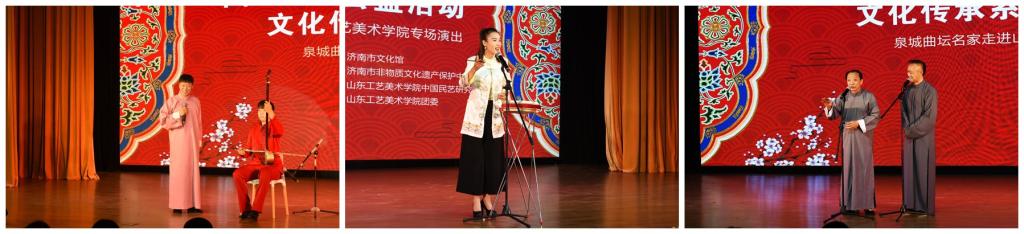演出现场,魏务良、赵荣娜等十余位国家一、二级演员,省、市级非遗传承人为现场观众带来了《有心常做济南人》、《武松打虎》、《矬大姐》等8个高品质节目,演出形式包括山东快书、山东大鼓、河南坠子、山东琴书、雷琴等曲艺类别。整场演出气氛热烈,高潮迭起,演员生动活泼的表演受到学校领导及师生们的高度喜爱与赞扬。