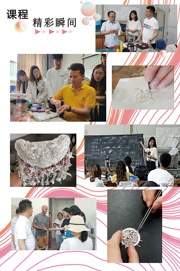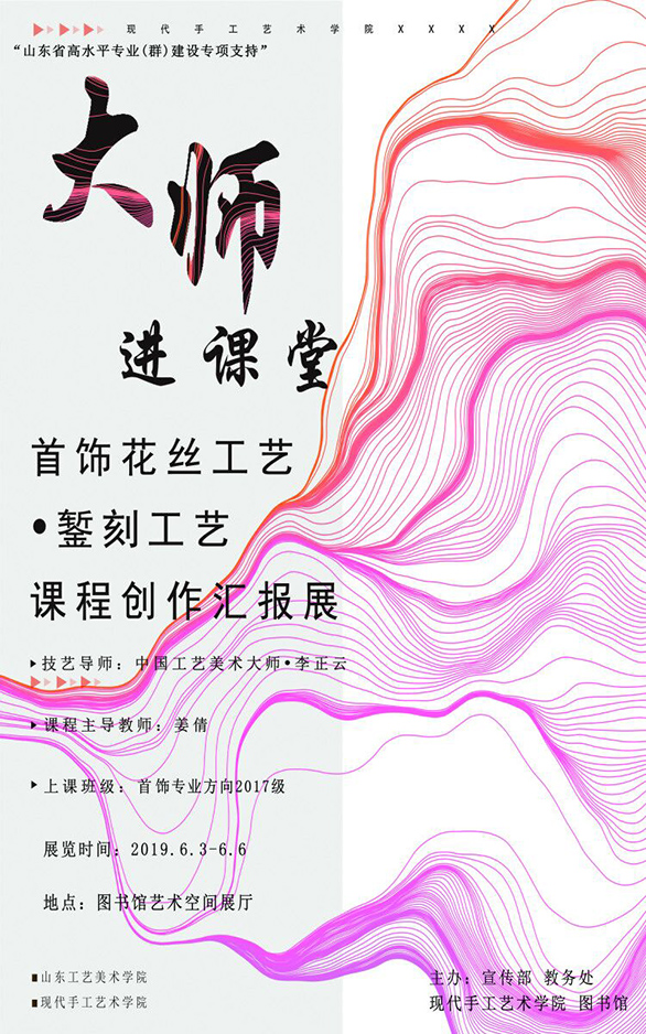 据悉,本次课程在党委宣传部、教务处、现代手工艺术学院和图书馆的支持下,邀请了中国工艺美术大师李正云老师作为技艺老师,由现代手工艺术学院姜倩老师作为课程指导教学,教授首饰花丝工艺和錾刻工艺并指导学生创作,2017级首饰专业同学共计完成150多件作品,展览持续到6月6号。(现代手工艺术学院)