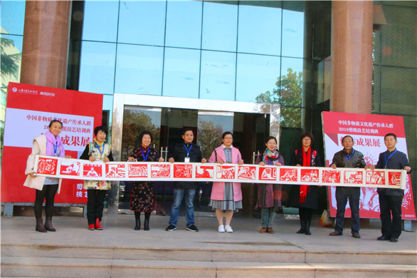 本次培训班和学校视觉传达设计学院第二工作室合作,结合学校45周年校庆,共同完成了山东好人的海报剪纸、猪年主题创作剪纸及衍生品的设计与开发,第二工作室张瑞、张培源两位老师带着第二工作室的学生和非遗传承人一起学习、交流,他们的设计意识、创新意识、品牌意识都给非遗班的学员们带来很大的启发,而学员们深厚的技艺表现又使学生受益匪浅。学员们纷纷表示,这次培训班的效果非常好,通过老师系统授课和学员之间的技艺交流以及创作实践,增长了知识、开阔了视野、提高了技艺,使今后的工作有了新的思路。