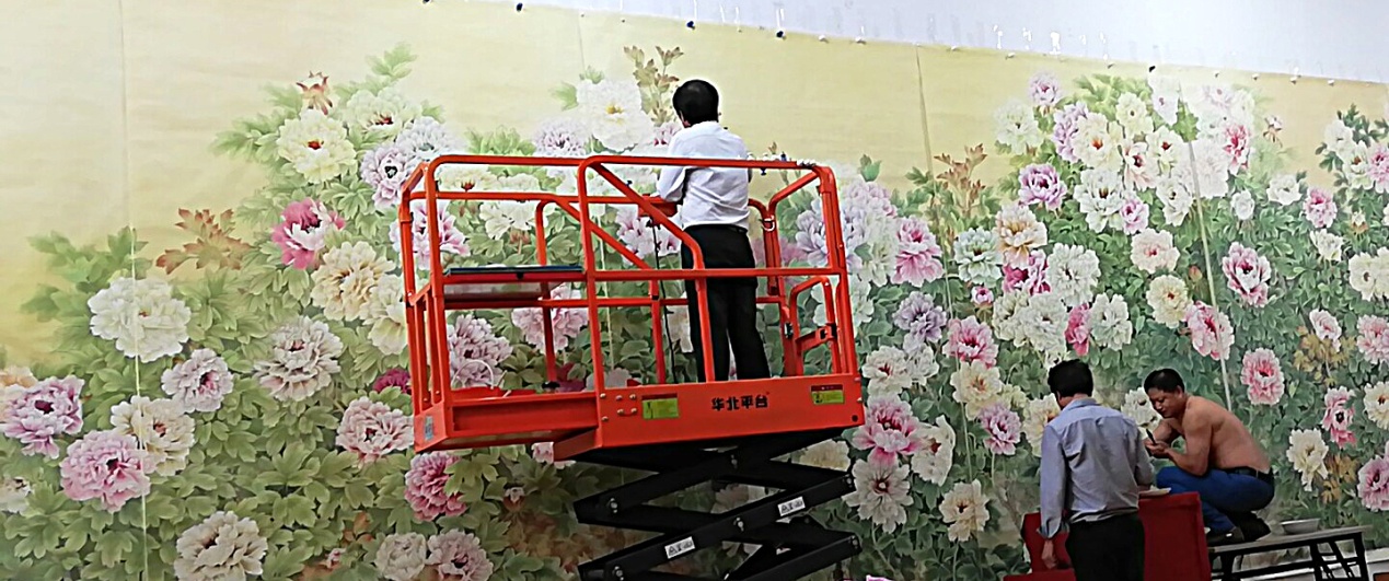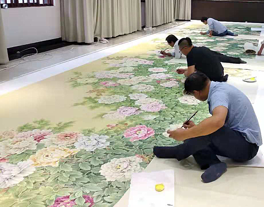 中国传统工笔画《锦绣春光》,高3米,宽15米,历时79天,画稿前后进行了16次修改。作品以国花牡丹为题材,象征着富贵、吉祥、美好的寓意。作品在继承传统工笔技法的基础上,融合当代绘画手法,精工细作而成,施笔严谨精湛,色彩绚丽多姿,充分展示了牡丹雍容华贵的特色。