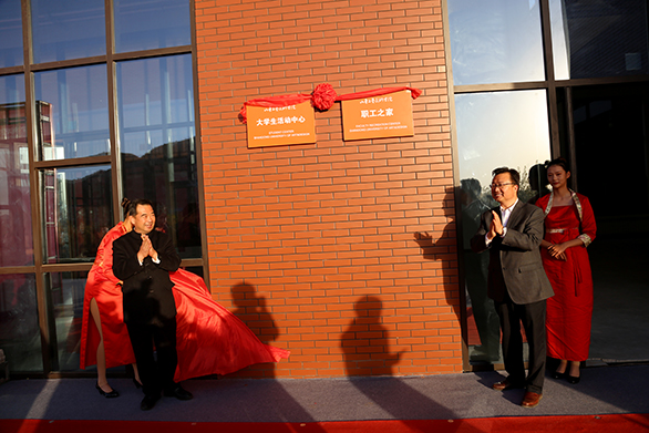 何思清与校友代表日照校友会袁博生共同为“大学生活动中心”、“教职工活动中心”揭牌。