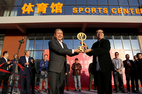 潘鲁生向学校艺术与设计实践教学中心主任张伟交体育馆金钥匙。