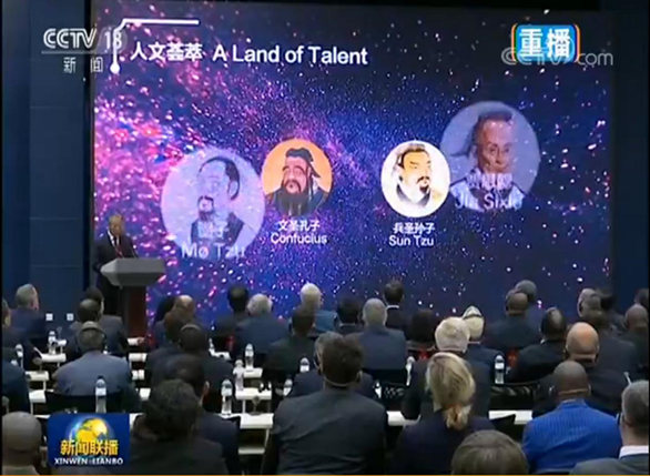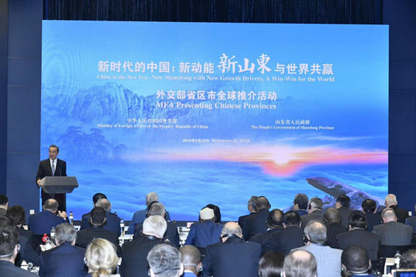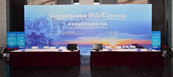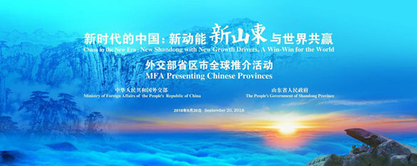 9月20日,由外交部和山东省人民政府举办,以“新时代的中国:新动能 新山东 与世界共赢”为主题的外交部山东全球推介活动在外交部蓝厅隆重举行。来自158个国家和国际组织的240多位驻华大使、外交官员,以及110多名中外记者,近40名国际知名中外企业代表,中央和地方有关部门代表共500多人云集外交部蓝厅。