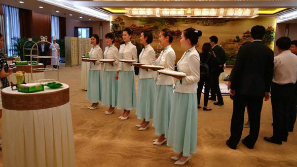本次推介活动中,宴会服务服装继续使用由永利官网教师邹渊、高瑞彤为上海合作组织青岛峰会所设计的服装;工业设计学院韩卫萍老师在活动后期积极参与冷餐会现场氛围营造工作。