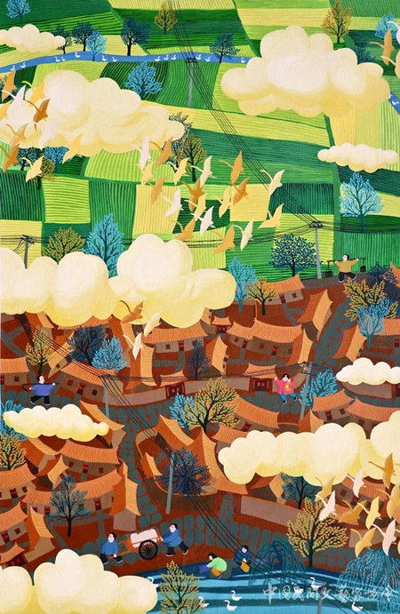应该说,乡土生活改变,农民画创作者、接受者的生活体验,主办方诉求等多种因素发生了变化,但农民画中最本质的昂扬向上的生活状态、对美好生活的向往与追求、对劳动对耕耘对收获的歌颂,是任何时代都需要的,是民间的价值观诠释和表达,在今天仍然具有生命力。所以,我们需要认识今天农民画的现状,分析和把握其中的变与不变,了解农民画创作群体的心态和生活状态,把握农民画背后的新乡土生活。我们认为,农民画是乡村振兴战略中乡村公共文化服务体系的有机组成部分。在乡村文化建设中,发挥农民画在伦理教化、审美娱乐、人格培养、启蒙认知、情感交流、文化塑造等方面对人的培育作用,在启蒙教育、素质教育、专业教育、职业教育、社会培训、大众传习等方面形成多层次的教育传承体系,有助于培养提升人文素质。通过农民画的集体创作,达成群体性认同,形成整体性承传,也有助于深化文化凝聚力。同时,深入挖掘农民画蕴藏的民族精神、乡土精神,将农民画中的文化基因与当代文化相适应、与现代社会相协调,以民众喜闻乐见、具有广泛参与性的方式进行推广和传播,有助于筑牢中国传统文化价值体系。农民画是可贵的,以农民之手绘乡村之景、状乡村之情,岁月的长河里会有变迁,会有发展,但永远是我们走进乡村的艺术之门。