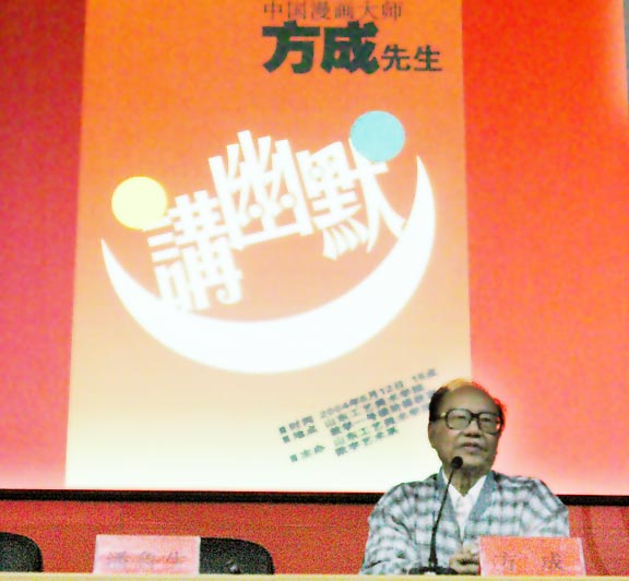 方成先生还以《讲幽默》为题举行了一场学术报告会,让同学们了解了漫画艺术创作所需的文化积淀与现实批判精神,也了解到幽默学研究对社会文化建设的重要作用。在多年的研究中,方老关注社会发展,关心百姓生活,他认为幽默是比滑稽更高一层面的艺术表现,“幽默出于睿智,不落套,无论是褒是贬或其他,都能给人以美感、雅趣和启迪。幽默之所以不易把握,就在于它出奇的创造性。”因此,他认为“在艺术实践上,很重要的一课是要把幽默和滑稽分清楚。如果幽默和滑稽分不清,很容易使人只靠滑稽逗笑而缺乏深一层的内容,缺乏艺术动人的魅力。”可见,他将对幽默的研究提升到了学术层面。方老还批评了当时盛行的“恶搞”现象,他认为“恶搞”仅是一种浅层的低级趣味,是迎合市场的产物,不是“幽默”的表达。方老言辞诙谐,深奥义理的讲述也能深入浅出,妙言联珠,颇受师生们的欢迎。