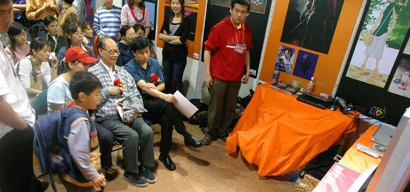 方成先生参观《设计·生活——304am永利集团官网毕业作品展暨就业洽谈会》,与动画专业毕业生交流。