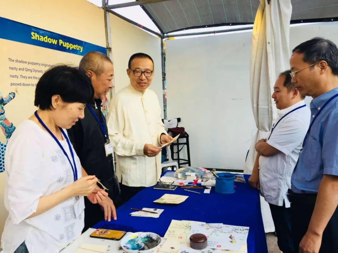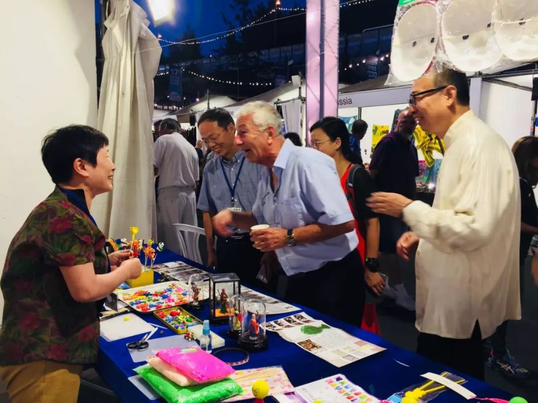 潘鲁生首先前往中国展区与我国参展民间艺术家们进行了现场交流。侯仰军、林泓魁向潘主席汇报了中国展区的参展作品特色与观众对民间手工艺的热烈反响,十天来中国展区始终是博览会最有人气的展区,收到了主办方和广大观众的高度评价和真心喜爱。潘鲁生与参展的广大艺术家就传统手工艺的传承与发展进行了交流,肯定中国团队在本届艺术节上所取得的成果,并对中国展区民间文艺家们所付出的努力表示感谢。他指出,作为民间手工艺的传承者,既要增强振兴传统工艺的时代使命感,深入挖掘民间手工艺的时代价值,让民间手工艺回归大众生活,融入时代命题,通过创意设计提升手工艺的自身价值,发扬大国工匠精神,加强中外文化交流,繁荣我国民间手工艺,提升民间文化国际交流的质量和水平,使其健康持续发展。