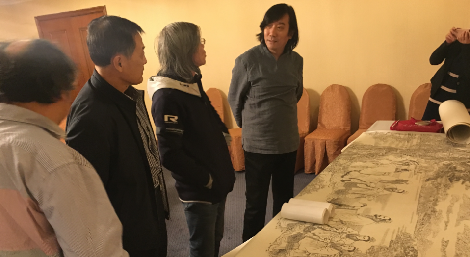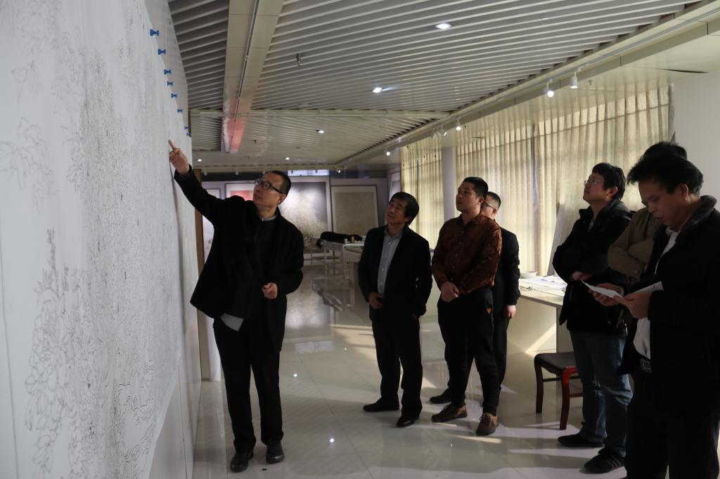 潘鲁生与李联起、赵长玉、高潭印、孙自安、孔庆臣研究《花开盛世》构图