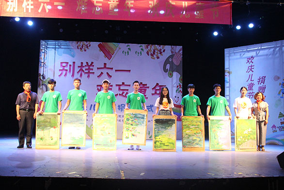 欢庆活动共分为参观、互动、捐赠三个环节。“阳光心社”的志愿者们带领小学师生观看了2018届毕业生毕业作品展后,在弧形广场开启了互动环节。首先,志愿者与小朋友们分八组进行“大手拉小手,共绘一幅画”。绘制过程中,志愿者们手把手地教小朋友如何绘画,传授绘画技巧,场面温馨感动。在志愿者与小朋友们的共同努力下,一幅《水塘荷花图》完美呈现。接着,建筑与景观设计学院合唱队用快闪和阿卡贝拉的方式演唱了一首《我爱你中国》。这种新颖独特的演唱方式赢得了小学师生的热烈掌声。之后,新屯小学的小朋友们为大家带来了活力四射的篮球操表演。内容丰富的捐赠环节在数字演播厅举行。建筑与景观设计学院党总支书记张东深致辞,代表建筑与景观设计学院全体师生对前来参加此次活动的领导及广大师生表示热烈欢迎和衷心感谢。新屯小学的少先队员代表们向董占军一行敬献并佩戴红领巾。建筑与景观设计学院向新屯小学赠送了见证两校友谊的《水塘荷花图》,“阳光心社”志愿者向小朋友们赠送了用爱心义卖所得购买的图书,并送上节日的祝福。新屯小学的孩子们进行了“家国情怀”经典诵读。生动的诵读传递出了孩子们对国家以及中华民族传统文化的热爱。新屯小学校长董梅向“阳光心社”优秀志愿者们颁发荣誉证书,并赠送锦旗致谢。