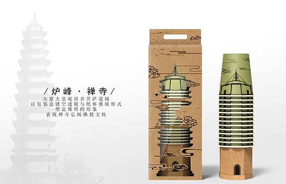 张宇同学设计作品“炉峰·禅寺”在付志伟和王奇光老师的指导下,以佛塔造型为设计出发点,通过对佛教文化与佛教建筑的综合分析,结合纸杯层叠结构,设计了一款具有佛教文化内涵的套装纸杯。