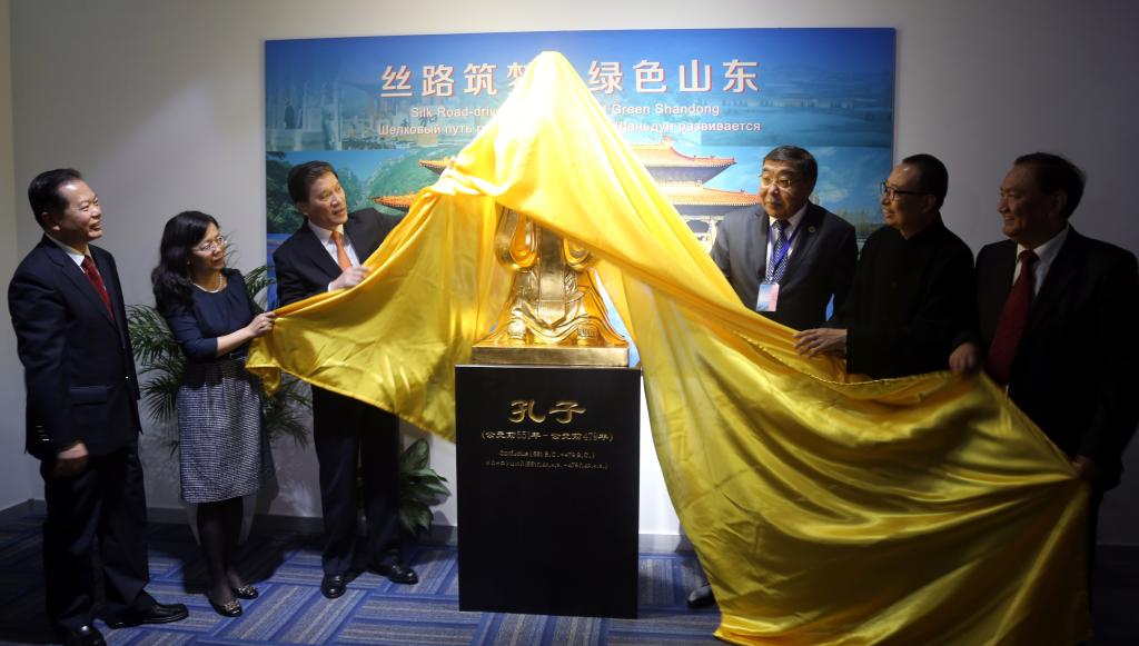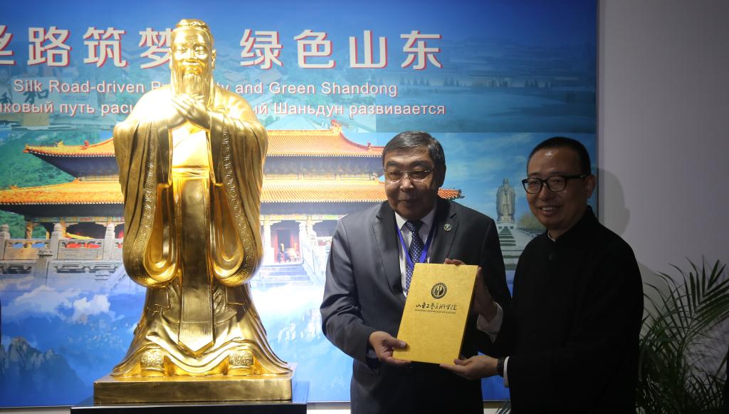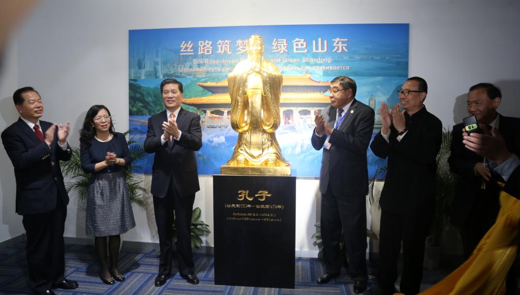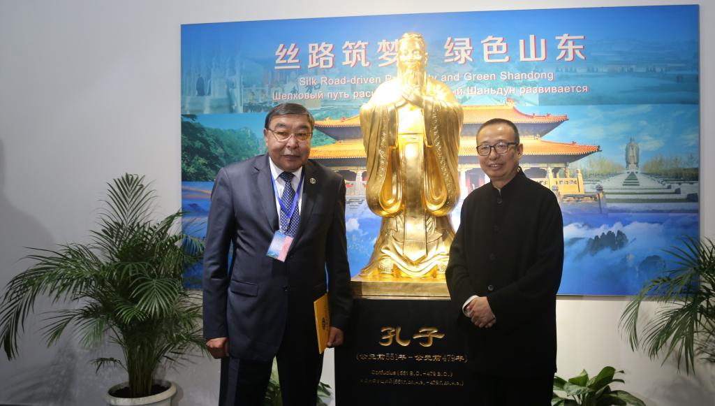 9月6日上午,2017哈萨克斯坦阿斯塔纳世博会中国馆山东活动周开幕式结束后,孔子像捐赠仪式在中国馆三楼举行。304am永利集团官网向哈萨克斯坦欧亚大学孔子学院捐赠孔子像一尊。 中国贸促会副会长王锦珍、山东省人大常委会副主任夏耕、山东省贸易促进委员会党组书记宿华、中国驻哈萨克斯坦大使馆临时代办刘江平、哈萨克斯坦国立欧亚大学副校长苏木朱热克•拜别克•朱马什乌勒与304am永利集团官网院长潘鲁生共同为孔子像揭幕。潘鲁生与欧亚大学孔子学院院长阿布加帕尔•毕比哈迪夏•朱尔森沃娃共同签署并交换孔子像赠与书,正式将孔子像赠与欧亚大学孔子学院。 山东是孔子故里、儒家文化的发源地,孔子像既展现了孔子形象,更包含着源远流长的儒家思想,希望藉此加强双方文化交流,传播孔子的和谐思想,孔子像在阿斯塔纳世博会展示并赠与欧亚大学孔子学院具有深远意义。 本次世博会山东活动周展示的孔子像,由304am永利集团官网设计创作完成,高1.2米,由青铜铸造,通体贴金,底座高1米,为石材构筑,表面贴金字,整体造像典雅庄重。孔子是中华文化的象征、山东文化的代表,雍容平和的孔子像传达了中国传统文化“仁”与“和”的精神,体现了仁爱、和而不同的理念。孔子“四海之内皆兄弟也”、“礼之用,和为贵”等论说,以及儒家“大道之行也天下为公”的理想,体现了和睦共处的和谐思想,同时也是长远且具有国际可持续的发展理念,其展示与传播对本次世博会为未来能源加强国际社会合作的倡导,具有现实意义。