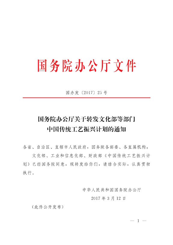 国务院办公厅关于转发文化部等部门中国传统工艺振兴计划的通知