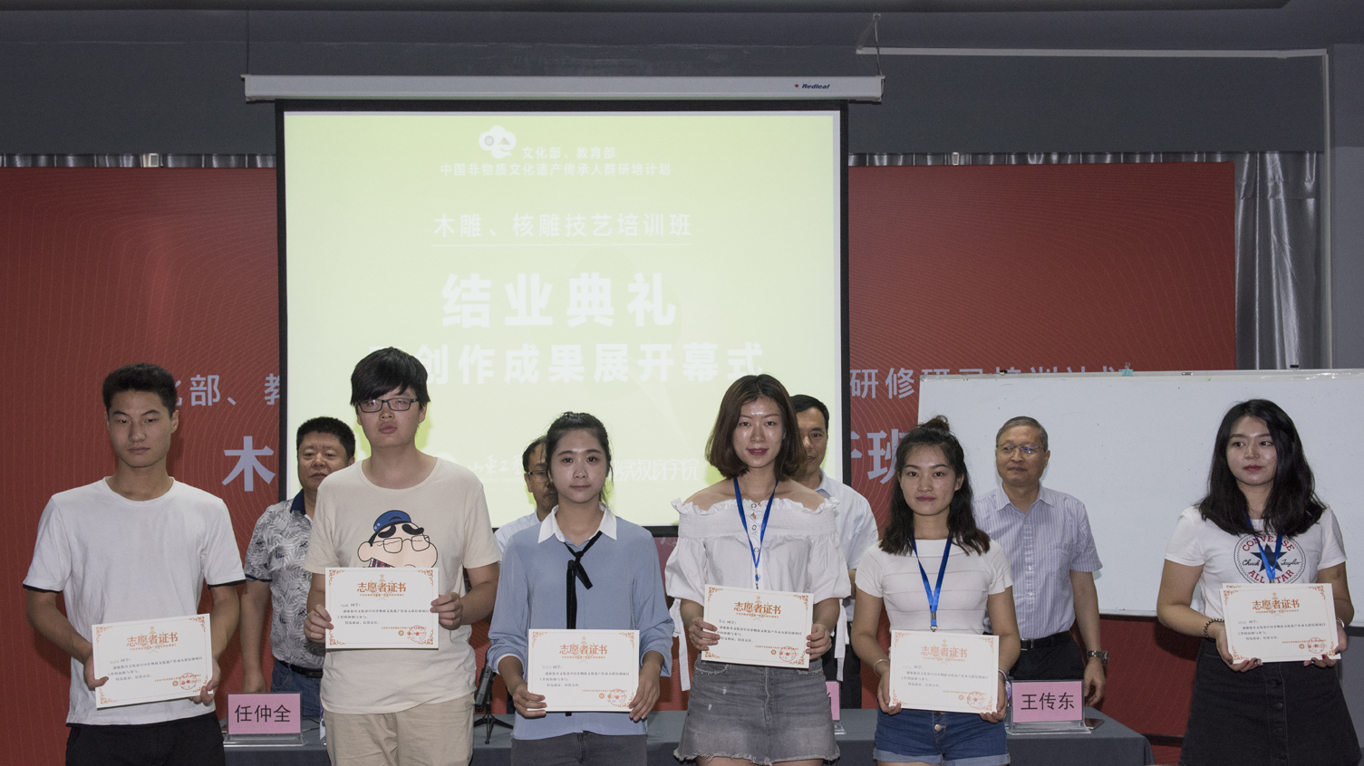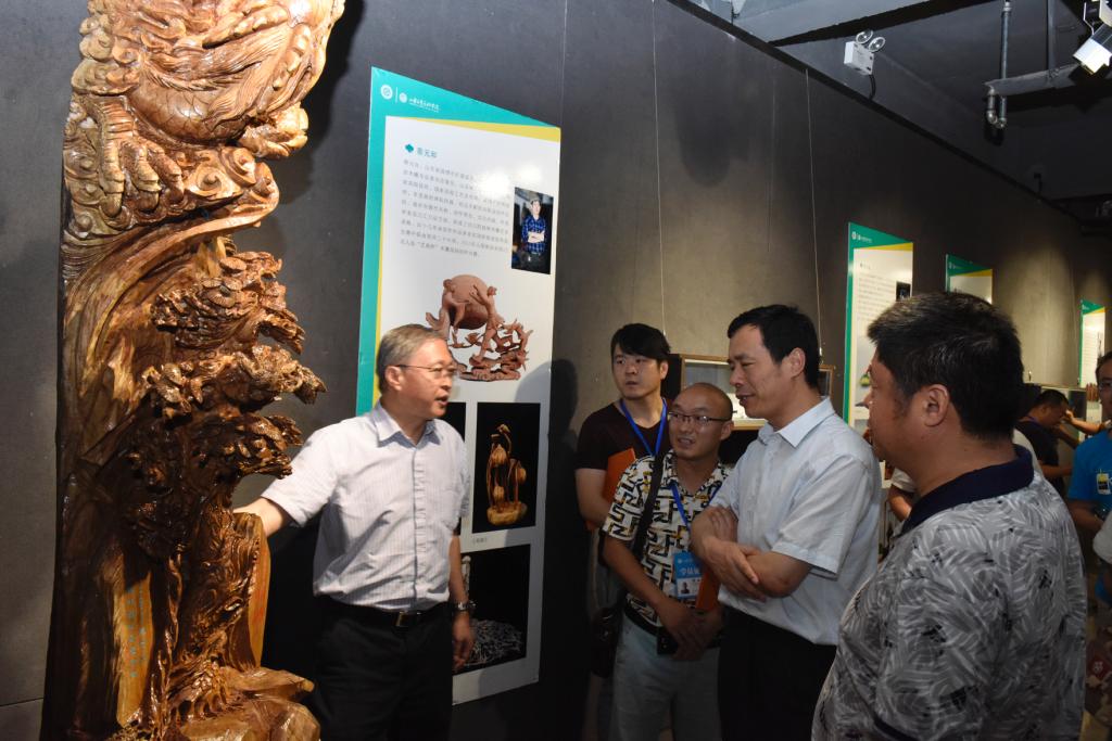 与会领导相继为学员颁发了获奖证书、收藏证书、结业证书,为一直以来为非遗班服务的学生颁发了志愿者证书。随后,与会领导参观了创作成果展,对学员们取得的成绩给予极大地肯定。展览共遴选出200余件(套)优秀作品参加创作成果展,作品包括木雕、核雕技艺创作、雕刻实践与绘制、衍生品开发制作、旅游纪念品设计等5大类别。作品在保留传统形式美感与独特韵味的基础上,力求有所创新,融入了当代设计元素与加工工艺,将传统文化与当代设计时尚元素、传统工艺和现代生活有机结合,使传统工艺焕发出新的生命力。