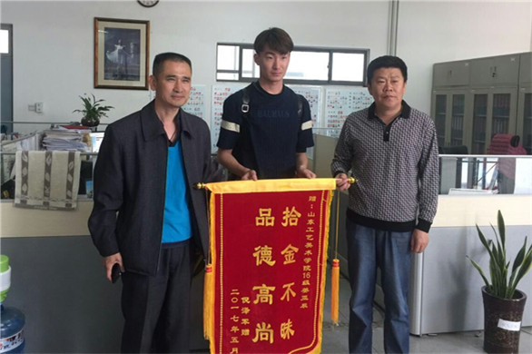 5月9日上午,服装学院16级服装工程班的姜亚辰同学收到一面“拾金不昧 品德高尚”的锦旗。