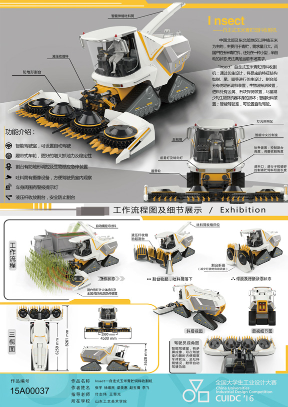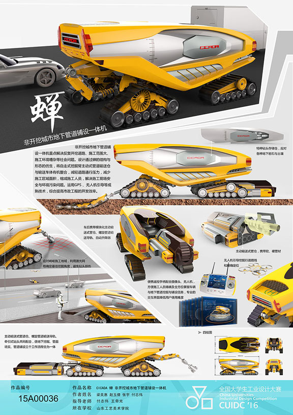 在广东省东莞市举办的“2016年全国大学生工业设计大赛”决赛中,由永利官网工业设计学院教师付志伟、王奇光指导的学生作品获得全国一等奖一项、二等奖两项、优秀奖六项。学生梁美惠、赵玉倩、张宇设计的“CICADA 蝉 非开挖城市地下管道铺设一体机”获得全国一等奖;学生张宇、徐维民、梁美惠、赵玉倩、李飞设计的“Insect自走式玉米青贮饲料收割机”获得全国二等奖;学生李海民、唐福气设计的“农用大蒜收获机”获得全国二等奖;学生钟宛衡、段智婷、王睿、贾瑞、吴楠设计的“蜣螂蔬菜大棚支援机器人”获得全国优秀奖;学生刘筱堉设计的“悠然子母体可拆分式路由器”获得全国优秀奖;学生王璞、相广强、高延硕设计的“ECO-Skyline新型城市公共交通系统”获得全国优秀奖;学生相广强、马文景、梁美惠设计的“Green-Fly农业多功能无人机”获得全国优秀奖;学生吴楠、李毅、孙南设计的“康健智能轮椅”获得全国优秀奖;学生徐志翔、刘益卿、周毅枫设计的“城市多功能子母式救护车”获得全国优秀奖。教师付志伟、王奇光获得“2016年全国大学生工业设计大赛优秀指导教师奖”。 大赛由全国总赛区和分赛区组成,开赛以来工业设计学院精心组织、师生积极准备,暑期组织教师团队留校辅导设计工作,在2016年8月份山东省分赛区的设计评比中,9件作品获得山东省分赛区一等奖,入围全国总赛区。在永利官网山东省高等教育名校建设工程的支持下,设计作品制作实体模型参加全国总决赛与设计作品展览活动。学生李海民参加东莞华南设计创新院举办的“中国设计新锐工作坊”,获奖师生团队获得邀请参加了全国大学生工业设计大赛优秀作品产业化路演、中国新锐设计师创业孵化与全国大学生工业设计大赛作品展等设计活动。