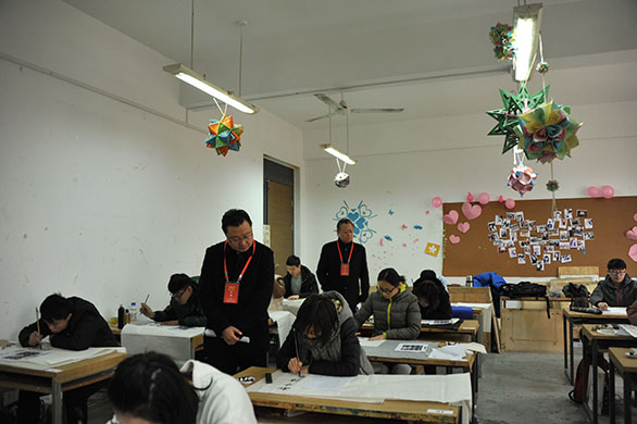 校领导仔细巡视了各个考场,认真查看了考生考试情况,详细询问监考人员考场信息,了解考场出现的问题及解决方案,并提出指导意见。校领导还巡视了考场监控室与试卷收发处,了解考试整体情况。校领导对井然有序的考场纪律表示满意,并对招生专业考试工作提出具体要求。 史论类、美术学(中国书体研究)招生专业考试于上午9:00正式开始,史论类考试科目为写作,美术学(中国书体研究)考试科目为碑帖临摹、书法创作。长清校区首次作为招生专业考试书法类、史论类考试考场使用。