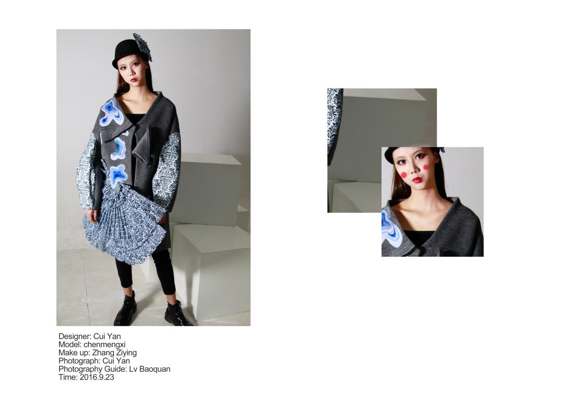 设计说明: 由于本次比赛是组委会提供指定面料,所以在设计上存在一定的难度。本系列作品以中国传统折子扇为另案来源,小小的折子扇代表着中国浓厚的文化积淀,通过对提花面料的二次再造,通过热压工艺将面料热压成褶皱,然后制作成扇子形状,服装的整体廓形,根据当下流行的廓形款式,能充分与市场相结合,颜色上采用浓郁的丽雅蓝色,代表着当代女性沉稳,优雅知性的感觉。在细节上采用了绗缝及羊毛毡的面料肌理表现形式,增加服装整体的设计细节与层次。