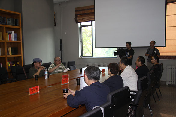、李新与李保田在千佛山校区进行座谈,就新时期艺术发展的轨迹、艺术家的历史责任感、艺术创作的经验和感悟、当代文化艺术的传承创新等问题进行了深入交流。