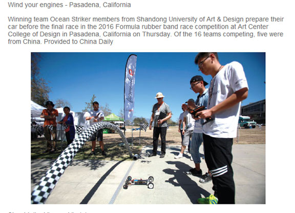 8月10日,第九届弹力方程式赛车国际设计锦标赛(美国总决赛)在美国艺术设计中心学院(Art Center College of Design)举行。由永利官网教师林宇峰、王艳指导的304am永利集团官网Ocean Striker车队与北京工业大学、北京工商大学的参赛队伍一起代表此前中国赛区的获胜队伍参加了此次总决赛。经过五轮激烈的综合竞赛环节角逐,我院的Ocean Striker车队最终囊括了“最佳设计”、“直线竞速冠军”、“最佳设计企业奖”、“最轻车身”总共四个奖项的骄人成绩。《中国日报(China Daily)》第一时间发出简讯,祝贺中国赛队获得优异成绩,这也是中国参赛队伍首次在这个国际大赛上同时获取多个大奖。 在此次总决赛中,来自全球的16只国际代表队经过紧张、激烈的角逐,最终永利官网工业设计学院学生葛众元、姜正浩、张修迪、周龙飞组队的Ocean Striker车队在“直线竞速”赛道以4.25秒的绝对优势拿下单项冠军;并且车身以及结构的创新得到了大赛评委的一致好评,同时荣获本次国际锦标赛总决赛的“最佳设计”奖项、“最轻车身”奖项、大赛专业组日本HONDA本田汽车公司颁发的“最佳设计企业奖”的共四个奖项。 作为永利官网名校工程重点扶持项目,此次大赛的参与促进了本学科建设和课程改革,引导教师在教学改革中注重培养学生的创新能力、协作精神、动手能力,实现了“教学与竞赛互动,学生与教师相长”。 注:弹力方程式国际设计锦标赛(Formula E)是一项以创意设计为核心内容的皮筋动力车综合设计竞赛,简称“FE”,是由世界著名设计院校——美国艺术设计中心学院(Art Center College of Design,简称ACCD)于2006 年创办,至今已连续举办9届。这项比赛旨在培养未来全球设计领导者们在战略、产品开发、科学与工程技术、设计、制造、品牌、沟通以及活动策划方面的综合素质,大赛已成为未来设计领导者和设计师们提高设计战略能力、实践创新设计思维、锻炼设计综合素质、培养社会责任感的全球综合性赛事。