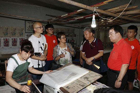 7月11日,学校党委副书记杨新力赶赴潍坊市寒亭区杨家埠,看望、慰问正在此间进行“三下乡”社会实践活动的继续教育学院“木版年画”保护与传承调研团队,并对永利官网暑期社会实践活动进行考察调研和现场指导。寒亭区宣传部常务副部长李猛,寒亭区宣传部文化中心主任赵颖、年画大师季乃仓先生、杨家埠木版年画社社长、丰泰文化公司总经理王永海、副社长陈克红、杨志斌以及有关方面的代表参加调研。