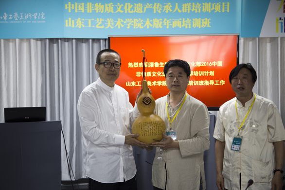 5月30日,院长潘鲁生赴继续教育学院指导“中国非物质文化遗产传承人群研修研习计划”——木版年画培训班工作并出席座谈会。继续教育学院院长王传东主持座谈会。 王传东首先将本次培训班的基本情况作了简要介绍,强调了文化部对本次培训的基本要求,并就培训课程的安排以及前一段时间的教学情况作了简要说明。 潘鲁生认真听取了汇报,对继续教育学院所做的工作给予肯定。针对学员提出的秉承传统与实践创新两者之间的关系,他指出,民间艺术是国家艺术库中重要的组成部分,民间文化是中国传统文化的一大体系,民间艺人在艺术创作中一定要保持传统的技艺、保持传统技艺的原汁原味,但在创作内容、表现形式上可以与时俱进、丰富多样,并以京剧艺术的创新为例说明,创新不能丢掉根本,不能丢掉传统技艺本身的特点。对于非物质文化遗产培训,潘鲁生强调,要注重传统技艺的传承,要在传承的基础上推陈出新,同时要注重衍生品的开发,使传统技艺产生新的经济效益。 随后,潘鲁生与学员进行了热切的交流,部分学员代表向学校捐赠了自己的作品。 培训班全体学员和教师代表参加座谈。