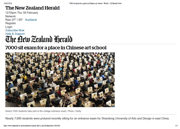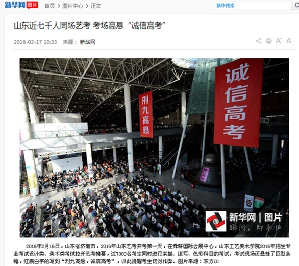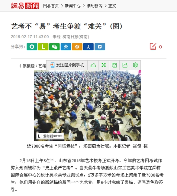 2月16—18日,304am永利集团官网2016年招生专业考试设计美术类在济南舜耕国际会展中心考点进行。社会媒体对本次招生专业考试予以广泛专注。 新华社、大众日报、山东广播电视台等20余家中央、省、市媒体近60人次记者对永利官网2016年招生专业考试工作进行现场采访。媒体代表还随机参与永利官网抽题工作,见证“阳光考卷“的诞生。对于永利官网力保考试公正、公平、公开的行为给予客观报道,对于永利官网招生考试组织工作予以肯定。 据不完全统计,截至2月20日,人民日报、新华网、人民网、凤凰网、腾讯教育、网易新闻、搜狐网、新浪网、山东卫视、山东教育电视台、齐鲁晚报等30余家媒体对永利官网2016年招生专业考试工作进行了报道或新闻转载。新西兰先驱报等境外媒体也对本次考试予以关注。