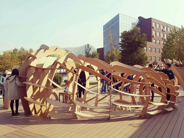 本次大赛的主题是“筑梦•家”,大赛分初赛和决赛两个环节,全校7个学院共有56个团队的方案入围初赛,通过专家严格筛选有12个团队的方案进入决赛,11月2日,进入决赛的团队在规定的8小时内于设计师广场完成了现场搭建。本届参赛作品中,既有简洁明快的线条元素,也有造型前卫的结构组合,但每一件作品都通过独特的表现形式表现出梦想中的“家”这一主题。参观中,校领导们来到参赛队伍中,悉心听取同学们自己设计作品的介绍,对每件作品一一作出点评,并给予参赛队员们肯定与鼓励。大赛也吸引了学校广大师生的关注,大家纷纷对同学们的奇思妙想和灵巧搭建发出由衷的赞叹。最终,经过评委审定,工业设计学院的作品《wood joints》获得本次大赛一等奖,视觉传达设计学院的作品《思维空间》和现代手工艺术学院的作品《天空之城》获得二等奖,数字艺术与传媒学院的作品《巢》和建筑与景观设计学院的作品《蜂巢》、《定格》获得三等奖。至此,本次大赛圆满落幕。