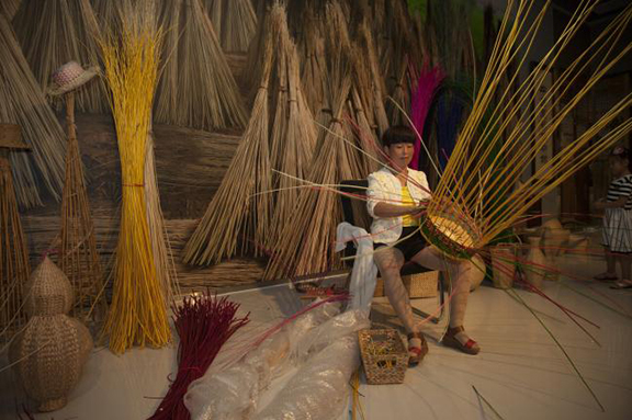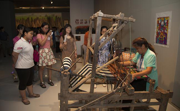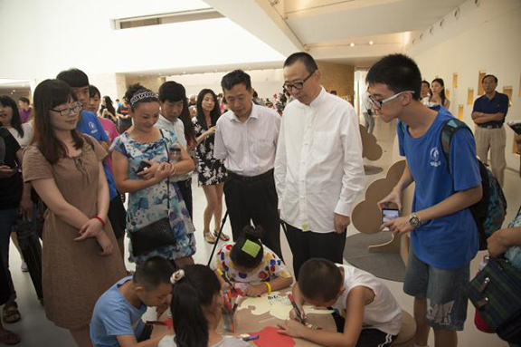 潘鲁生与柳延春在展览现场观看孩子们的手工艺术活动