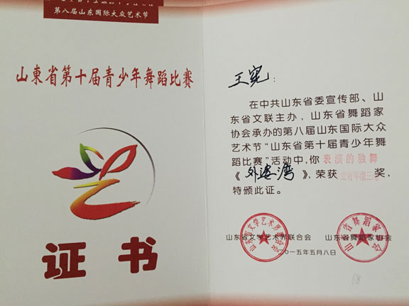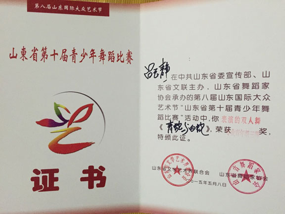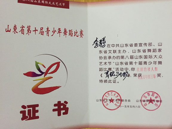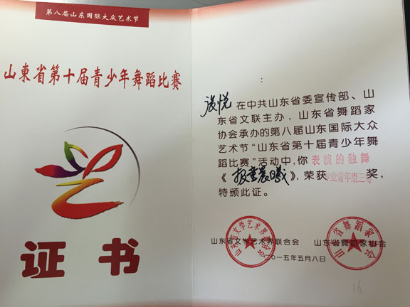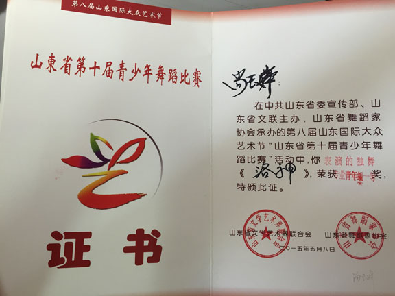 2015年6月6日,由山东省文联、山东国际大众艺术节组委会、山东省舞蹈家协会主办,被列为第八届山东国际大众艺术节”的活动之一的山东省第十届青少年舞蹈比赛暨山东省优秀青少年舞蹈精英展演在山东剧院举行。 此次比赛,永利官网服装学院舞蹈表演专业选送的6个节目均获得了优异的成绩,在服装学院尹珂老师的带领和悉心指导下,舞蹈班同学参加的专业组比赛中,2014级舞蹈班学生尚玉婷舞蹈剧目《洛神》、刘译泽舞蹈剧目《且看行云》均获得了一等奖的好成绩,2014级赵玉佳同学的舞蹈剧目《江枫渔火》获得了二等奖,2013级舞蹈班王宪《外婆湾》、张悦《报童晨曦》、李腾和吕玉静同学的《青蛇白蛇》舞蹈剧目均获得了三等奖。同学们能得到如此可人的佳绩离不开尹珂和郭贝若二位老师的悉心指导与辛勤付出,让学生在比赛中脱颖而出,取得了可喜的成绩。 此次比赛,为同学们提供了一个展示自我风采的平台,展现她们扎实的基本功和较高专业水平,提升了同学们的舞台表演技艺,为学校争得更多更高的荣誉。