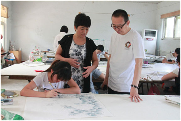 2014年7月23日,山东省文联主席、304am永利集团官网院长潘鲁生教授与永利官网“六艺学者”、英国杜伦大学人类学教授罗伯特·雷顿带领由永利官网青年教师、研究生组成的课题组,专题调研山东巨野农民工笔绘画。此次调研为国家社科基金艺术学重大项目“城镇化进程中民族传统美术现状与发展”的个案研究任务,是对山东现代民间绘画考察的第二站。课题组旨在运用艺术学、人类学、民俗学等跨学科的研究方法,考察巨野农民工笔绘画在城镇化进程中由于生存空间、文化生态系统的转换所引发的艺术流变、保护与传承、创新与发展等问题,通过以小见大的研究视角,由具体的个案调研走向文化现象的整体总结与把握。 在巨野县,潘鲁生院长与罗伯特·雷顿教授带领课题组成员寻找并走访了农户、书画院、农民绘画专业合作社等不同类型的农民工笔绘画生产组织形式,采访了姚桂元、徐凤秋、祝梦梦等十余位老中青三代农民画艺人,通过逐一进行访谈,课题组详细了解了巨野农民工笔绘画30余年的发展历程,以及随着时代的发展在题材、技法、艺术特色等方面所发生的变革与创新,对当下农民工笔绘画艺人的传承谱系、生存状态、创作方式、创作动机、销售方式、交流传播方式、传承方式等方面进行了调查,获取了准确可靠的数据化信息,掌握了一批生动真实的 个案实例,为进一步深入研究城镇化进程中传统美术的生存现状并提出可实施性的保护与发展策略做好了基础准备。 在调研中,潘鲁生院长指出与日照农民画由年画发展而来并明显受到政治宣传因素影响不同,巨野农民工笔绘画生发自当地的文人画基础,是工艺美术产业兴起和市场经济的产物,尤其是以书画院、专业合作社的生产组织形式将农民画的创作与市场紧密结合,促进了绘画人才培养与工笔画产品销售。针对巨野农民工笔绘画发展现状,潘鲁生院长指出当前巨野农民工笔绘画作品己有较大的知名度,有着广泛的群众基础,也有一定的书面市场占有率,但针对巨野县工笔画的专业队伍还需要加强,绘画风格要突显工笔画特色,所以要顺应时代的需求必须创新,并提升工笔画绘画在书画产业中的竟争力,开拓更大的市场。首先,潘鲁生院长建议每个画院应专门培养一两名能够搞创作、造型能力的高级画师,同时与高校合作,选拔优秀青年画师进入高校进修深造,也可以邀请一些专家教授来巨野进行现场培训。其次,在题材创作方面,巨野工笔绘画应强调牡丹乡里画牡丹,麒麟之乡画麒麟,画出两大吉祥主题,画出工笔表现手法,画出地方的艺术特色。表现出地域文化、传统文化以及现代科技带来的牡丹特色品种;画出吉祥文化、地方特色的麒麟文化符号;同时可以拓宽题材范围,例如增加瓜果蔬菜等表现农家生活的事物,以及表现颇具地方特色的戏曲之乡的地方文化艺术等。再者,巨野农民工笔绘画目前主要面向大众市场,限制了水平的提高,应着力打造地方品牌,形成价格联盟,避免同行业恶性竞争;画师创作要分开层次,对于技艺精湛的高级画师要重点推介,以开拓更加高端的市场,初学的画师可集体推介,占有已形成的大众市场。最后,潘鲁生院长将巨野工笔绘画的发展要素归纳为三个要点:一是要牢记艺术的根不能断,二是要注重传承与创新,三是要积极面向市场。强调课题组在研究中应重点关注巨野农民工笔绘画与地域文化、工艺美术产业、城镇化发展进程关系的梳理,深入发掘农民工笔绘画的艺术性与社会性,文化性与市场性的关系。 潘鲁生院长还应巨野县文联和画院的提议,对部分艺人的作品进行了现场点评,就造型、构图、用色、构线等方面进行了细致指导,并希望青年画师勤学苦练,打好基本功,多写生,多观察,多练功,在打好造型的基础上勤于创作,提升巨野农民工笔绘画的总体水平。
