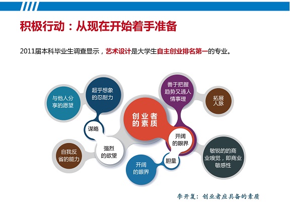同学们: 今年是五四运动95周年、共青团成立92周年,选择在这个时候以“青春创业”为题做一场讲座,既是因为一年一度毕业季到来之际有很多新的资讯想和大家分享,共同探讨和展望就业创业之路,也是因为这个属于青年的月份和节日让人充满感慨,我们由衷地相信社会的发展是由年轻人推动的,特别是在设计改变世界、成就梦想的时代,你们应该有一个精彩的未来。 泰戈尔曾说:“最好的东西并不是独来的,它伴了所有的东西同来”。就像此时,最好的年轻时光,充满无限可能的未来,但也有彷徨和压力,对于即将走出校门的同学来说,需要面对的还有“史上更难就业季”,套用一句老话是“机遇与挑战并存”。但你们确是处在这样一个重要的时代,新创意、新技术无所不在,设计发挥重要的整合与驱动作用,从战略新兴产业到日常生活方式都在发生深刻变化,作为一个艺术与设计专业的学生来说,你们拥有一个空前广阔的舞台,就像歌里所唱“没有人能够随随便便成功”,竞争和挑战也将更严格地检验你的素质、能力、胸襟和视野。机会等待有准备的人,所以要深化认识,及早规划,掌握航程,做事业人生的主人。 应同学要求,我们今天谈三个问题:一、需求与机遇——产业创新发展,社会需要什么样的人才? 首先,让我们看看产业创新发展带来的巨大改变。当前,以“3D打印”技术为标志的“第三次工业革命”兴起,这是制造业领域的重大变革,在新技术、新材料、新工艺的支持下,制造业趋向智能化和创意化,制造业领域的“智能创意经济”时代来临。显然,当产品以“打印”形式快速生成,通过条形码、图像识别等技术接入物联网,通过手机等职能终端实现现实与虚拟的连接,那么,最具核心价值和关键意义的,无疑是设计。同时,由于通讯技术发展,产业业态变化,设计的整合与驱动作用更加关键,设计的潜在资源和市场更加广阔。具体而言,市场需求更为个性化、定制化和多元化,设计应用范围更加广阔;互联网巨型平台建立,设计开发,创业发展更加容易;传媒业重构,海量互动的“平民化”传播体系建立,自媒体兴起,设计产生裂变效应;IT、通讯、传媒、创意产业界线日趋模糊,信息服务产业里,设计发挥新的整合作用。另一个重大改变在于,“大数据”时代到来,以“云”(云计算)、“物”(物联网)、“数”(数字化)、“智”(智能化)、“大”(大数据)为关键字,通过云计算技术,对互联网上的海量数据进行挖掘分析等专业化处理,形成更强的决策、洞察和流程优化能力。如哈佛大学社会学教授加里•金所说,“这是一场革命,庞大的数据资源使得各个领域开始了量化进程,无论学术界、商界还是政府,所有领域都将开始这种进程。”举例来说,近日淘宝已运用大数据技术,分析顾客需求与喜好,设计定制个性化家电。可以说,大数据时代带来设计思维、设计运作机制的重大改变,将改写设计进程。 在这样的形势下,“中国设计”提上政策议程。2012年12月,习近平总书记视察顺德广东工业设计城,对广东家电制造业通过设计创新进行产业转型发展的思路给予高度肯定,鼓励壮大设计师队伍。2014年,国家做出一系列设计产业发展决策部署,包括:1月22日,李克强总理主持召开国务院常务会议,部署推进文化创意和设计服务与相关产业融合发展;3月5日,政府工作报告提出,“促进文化创意和设计服务与相关产业融合发展”;3月14日,国务院印发《关于推进文化创意和设计服务与相关产业融合发展的若干意见》;此外,3月17日国务院印发《关于加快发展对外文化贸易的意见》以及4月3日教育部印发《完善中华优秀传统文化教育指导纲要》也与设计的文化传播和传承紧密相关。政策重点也在于,推进设计服务业与一、二、三产业融合发展。这也是从国家层面,明确并进一步拓展了设计应用领域,为设计发展提供了政策性机遇。世界经济已经发展表明,人均GDP超过3000美元时,拉动城市经济增长的主要动力是创意产业、高科技产业和服务业。我国主要中心城市人均GDP均已超过3000美元,居民消费中心向文化、教育、旅游转移,产业转型条件具备,文化创意产业发展前景良好。设计服务处于产业链的高端,具有高知识性、高增值性和低能耗、低污染等特征。对于提升各行各业的产品和服务品质,增加附加值、塑造品牌、提升市场竞争力具有重要意义。设计将引领消费潮流、拉动经济增长、增加就业机会。从根本上说,文化创意和设计服务业发展将促使社会分工越细越多,市场的广度和深度增加,对创新型人才的需求越来越大。 具体就人才需求而言,一方面,产业发展及社会需求促进人才培养方式转变。未来人才需求导向为“创新型人才”、“复合型人才”、“应用型人才”、“专门型人才”。其中,“创新型人才”有助于推动知识经济可持续发展,“复合型人才”有助于降低产业交叉融合产生的劳动力成本,“应用型人才”能够将知识、科技迅速转变为现实生产力,“专门型人才”集“专业型”、“技能型”、“应用型”人才优势于一身,突出某方面专门特色。另一方面,就业困局呼唤能力本位。在新近召开的国务院常务会议上,李克强总理部署加快发展现代职业教育, 强调“崇尚一技之长,不唯学历凭能力”。教育部表示,我国也将出台改革措施,"技能型人才"和"学术型人才"高考分离。总之,破除学位本位