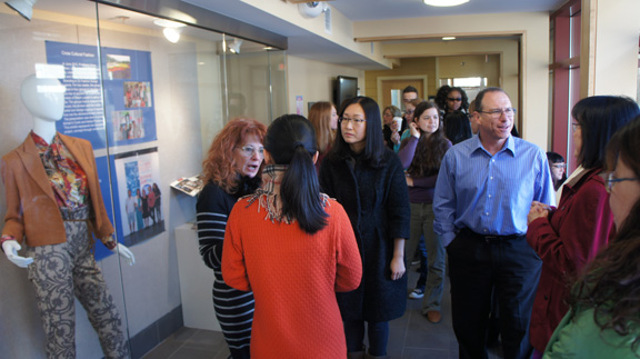 当地时间2013年11月20日,经过中美双方精心准备,中美合作课程《西方时装品牌》作品展在拉塞尔学院服装系举行了开展仪式。拉塞尔学院副校长Jim Ostrow、服装系系主任Lynn Blake、教授Anne Trevenen及拉塞尔服装系的师生参加了开展仪式。开展仪式由拉塞尔学院服装系系主任Lynn Blake主持。 服装系系主任Lynn Blake首先热情地向来参加开展仪式的师生介绍了永利官网代表团,拉塞尔学院副校长Jim Ostrow致辞,对远道而来的中方代表团表示欢迎,并对中美合作课程取得的成果表示祝贺。随后Anne Trevenen教授向大家详细介绍了中美合作课程《西方时装品牌》在中国的组织和上课过程,对永利官网学生和老师在为期两周的课程中体现出来的勤奋认真与敬业精神表示赞赏。她提到,课程中有些内容中国学生是第一次接触,她对中国学生能在较短内完成这样高质量的作品呈现给大家感到惊讶。她认为这次展览对拉塞尔服装系的学生来说,是一次难得的学习和交流机会。 开展仪式结束后,拉塞尔服装系师生与永利官网代表团在展览现场就相关专业问题进行了面对面的交流和探讨。服装系系主任Lynn Blake表示,希望能够邀请永利官网教师来拉塞尔学院进行授课,进一步促进两校在服装教学方面的交流与合作。