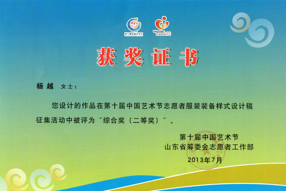 在第十届中国艺术节山东省筹委会志愿者工作部举办的第十届中国艺术节志愿者服装装备样式设计竞赛中,由邹渊老师指导,服装学院第一工作室10级学生杨越获得第十届中国艺术节志愿者服装装备样式综合奖二等奖(一等奖空缺)。 作品灵感元素提取第十届中国艺术节的吉祥物凤凰等元素,体现了十艺节的办会宗旨和新时期青年志愿服务特点。经专家评委会严格评审,结合十艺节志愿服务的实际需求,设计作品将在十艺节志愿者服装中被实际采用。