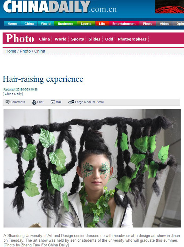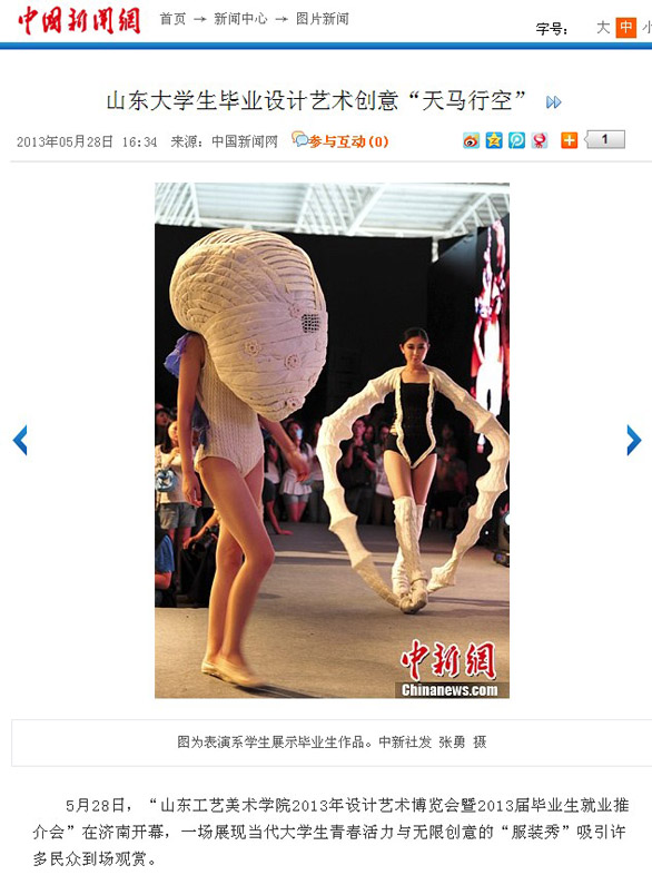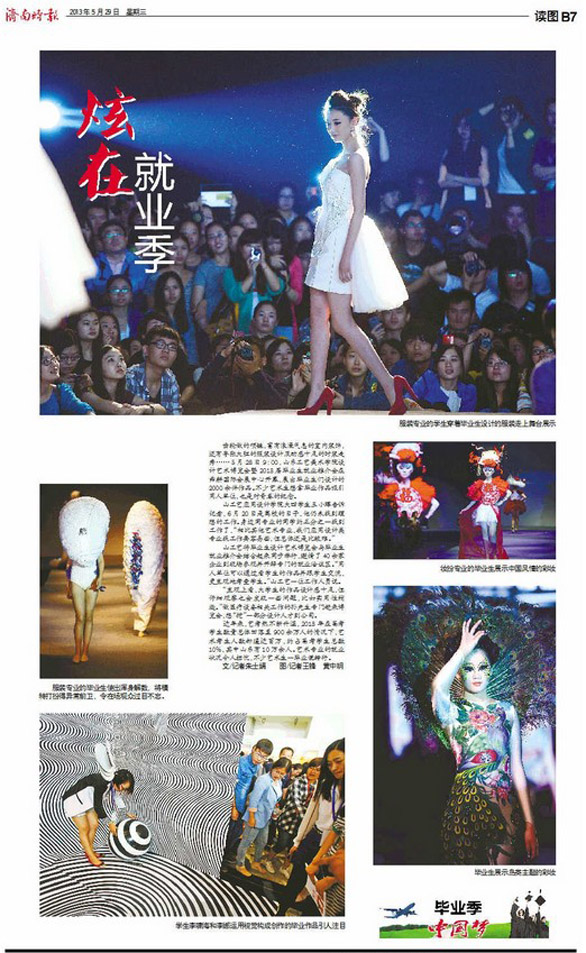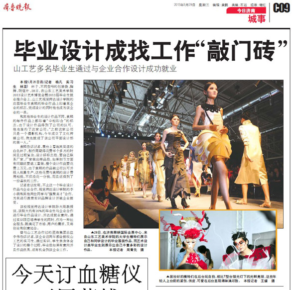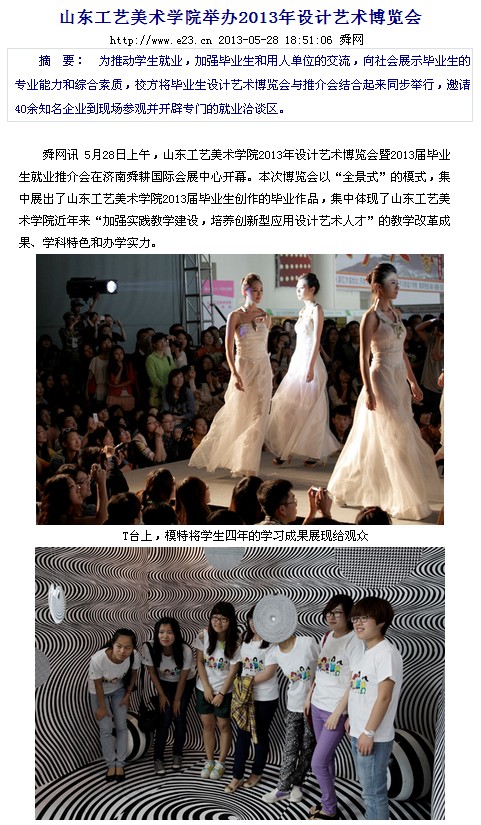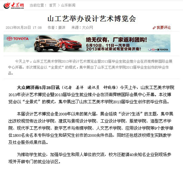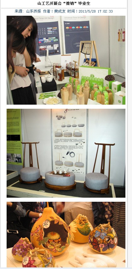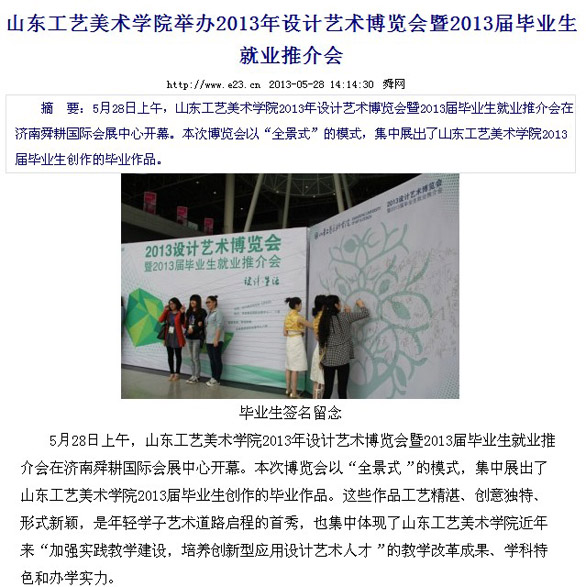 5月28日至30日,以“设计•生活”为主题的“304am永利集团官网2013年设计艺术博览会暨2013届毕业生推介会”在济南舜耕国际会展中心隆重举行。博览会不仅吸引了众多市民和艺术爱好者参观,也受到了省市多家媒体的关注。 新华社、中新社、中国日报、中国文化报、山东广播电视台、山东教育电视台、济南网络广播电视台、齐鲁晚报、生活日报、山东侨报、山东商报、济南日报、济南时报、都市女报、大众网、齐鲁网、山东新闻网、舜网、城色杂志等二十余家媒体记者到博览会现场参观采访。
