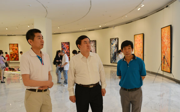 深圳市委常委、市纪委书记丘海(中),深圳市文体旅游局局长岳川江(右),关山月美术馆馆长陈湘波(左)参观展览。