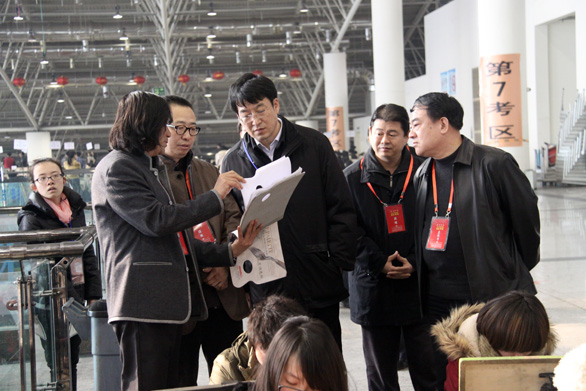 2月21日下午,山东教育招生考试院院长陈国前、院长助理张志刚一行视察304am永利集团官网2013年招生专业考试现场。304am永利集团官网院长潘鲁生,党委副书记杨新力,党委副书记、纪委书记裴新锋,副院长刁在祥、张云龙、苗登宇,院长助理王立果陪同视察。 陈国前一行在校领导陪同下巡视了考场。巡视过程中,永利官网领导详细介绍了招生专业考试报名、考试内容、试题抽取、媒体监督及安全保卫等具体情况。招生考试院院长陈国前一行对考试的有效组织和现场的良好秩序表示满意。 巡视结束后,永利官网领导与山东教育招生考试院领导在会展中心大厅一楼会议室进行座谈。座谈中,陈国前院长指出,招考工作是艺术院校的一项重要工作,应时时刻刻为考生着想,保证广大考生的利益。 304am永利集团官网相关工作人员陪同视察。
