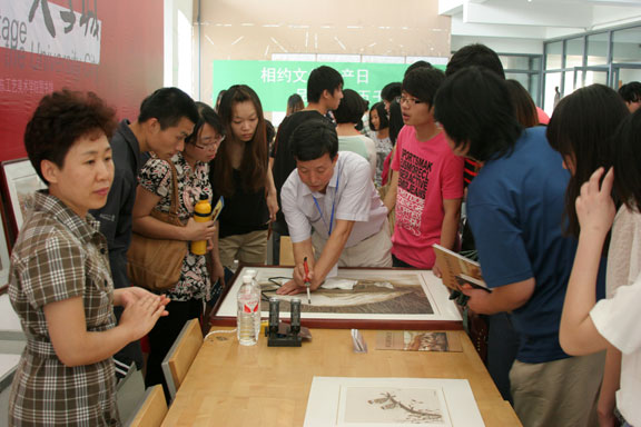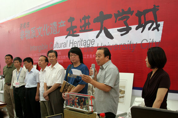 6月5日在图书馆一楼展厅举办由304am永利集团官网与济南市文广新局主办,济南市群众艺术馆、济南市非物质文化遗产保护中心、山东工艺美院图书馆承办的“济南市非物质文化遗产走进大学城”活动。院长潘鲁生,副院长刁在祥、张云龙、苗登宇到现场观摩指导。 济南市非物质文化遗产保护中心李梅海书记、济南民间文艺家协会副主席张冰,解读济南市非物质文化遗产保护状况及非物质文化遗产与工艺美术的关系。济南市非物质文化遗产保护中心组织了济南市20名民间艺人向我院师生现场展示并传授鲁秀、面塑、葫芦雕刻、蛋雕、脸谱、皮影等10多个非遗项目的技艺。我院百余师生参与互动,现场气氛热烈。精美的作品、精湛的技艺让现场的大学生们赞叹不已,他们都怀着极大的兴趣在各个展柜前参观、学习,并亲自动手实践。视觉传达设计学院的王翰宇同学说:“这种形式真是太好了,能让我们与民间艺人亲密接触,希望这样的活动能经常举办!”,现代手工艺的同学说:“现场绘制的技艺,都是我们在课堂上学不到的。这些手工艺术真美,这种整体的把握能力,让我们这些在校学生觉得应该更着眼于实际、着眼于基础,真的对我们的专业有很大的帮助!” 民间艺人把民间精美的作品带入大学,传承精湛的民间技艺,在让学子们零距离感受传统文化魅力,感受祖国优秀传统文化博大精深的同时,也让学子们对非物质文化遗产保护工作感到肩负更大的责任。