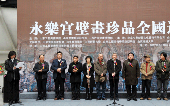 2012年3月9日下午,由山西古代壁画博物馆、山东工艺美院、山东壁画艺术研究院联合主办,北京今鼎新翰文化艺术有限公司、山东工艺美院美术馆联合承办的“群仙壁至——永乐宫壁画全国巡展(济南站)”在304am永利集团官网美术馆开幕。 中国美术家协会壁画艺委会副主任、山东省壁画艺术研究院院长、原304am永利集团官网院长张一民,北京神富投资集团董事长富建华分别为展览致辞。304am永利集团官网党委副书记杨新力,副院长李新、苗登宇,山东当代国画研究院院长、304am永利集团官网教授郭志光,山东省美术家协会秘书长王宇鹏、山东省壁画艺术研究院副院长孙景全等嘉宾出席开幕式。开幕式由304am永利集团官网副院长苗登宇主持,北京今鼎新翰文化艺术有限公司赠送304am永利集团官网壁画作品手卷《朝元图》,作为学校的教学资料。 永乐宫壁画创作于元代,历经七百余年岁月风霜依然保存完好。在艺术界,永乐宫壁画与敦煌壁画齐名,并称“东方壁画艺术最高典范”。它不仅是我国绘画史上的重要杰作,在世界绘画史上也是罕见的巨制。永乐宫壁画原作现存于山西省芮城永乐宫,满布在四座大殿内。这些绘制精美的壁画总面积达960平方米,题材丰富,画技高超,它继承了唐、宋以来优秀的绘画技法,又融汇了元代的绘画特点,形成了永乐宫壁画的可贵风格,成为元代寺观壁画中最为引人的一章。其中位于永乐宫三清殿的《朝元图》壁画高4.26米,全长94.68米,总面积为403.34平方米,是永乐宫壁画中的重点。本次展览主办方便是以《朝元图》为重点展览对象,在山东工艺美院展览馆5号厅根据原画作陈列布局,完整再现给山东人民。 此外,本次展览主办方还带来了中国碑帖中四大名帖之一的《绛帖》、被唐太宗李世民奉为国宝的中国行书入碑第一帖《晋祠之铭并序》、中国七大孤本大藏经之一,至今仍深藏山中的《明·万历藏》、中国最大碑帖,三绝碑之一的《昼锦堂》碑帖朱拓等珍贵文物高仿品呈现给山东书画爱好者。 学校美术馆、造型艺术学院等有关单位负责人出席活动。开幕式结束后,出席活动的嘉宾、壁画研究专家举办了壁画艺术学术研讨会,共同探讨了中国壁画的发展与方向。本次展览于2012年3月10日在山东工艺美院美术馆(长清校区)正式向公众开放,展期一周。