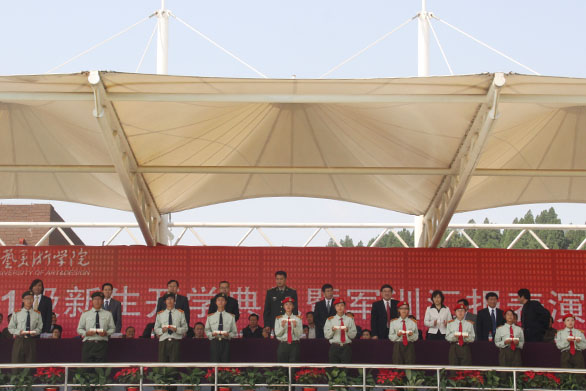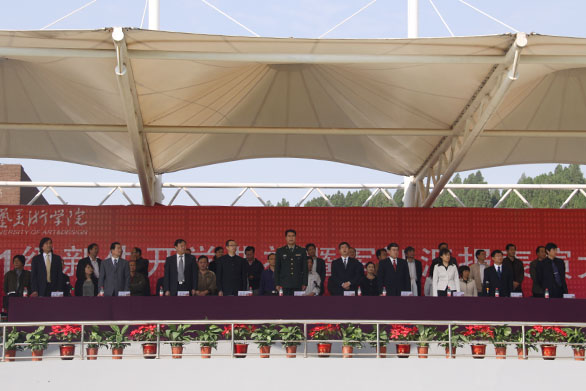 9月30日上午,永利官网2011级新生开学典礼暨军训汇报表演在长清校区体育场隆重举行。永利官网党委书记于茂阳,院长潘鲁生,党委副书记杨新力,党委副书记、纪委书记裴新锋,副院长李新、刁在祥、张云龙、苗登宇,院长助理、办公室主任王立果,中国人民解放军72253部队副政委侯宗运出席本次大会。大会由副院长苗登宇主持。 在激昂的解放军进行曲中,永利官网2011级新生开学典礼暨军训汇报表演正式拉开了帷幕。院长潘鲁生检阅了全体参训新生,一声声“同学们好!同学们辛苦了!”、“院长好!为学院增光!”响彻上空。随后新生军训汇报表演正式开始。各方队伴着豪迈的乐曲声在教官的指挥下依次步入会场。同学们用立正、稍息、齐步走、正步走的步法,借用赤手双拳、红黄锦旗,分别展现了队列表演、坦克兵体操、军体拳、旗语操,步伐整齐,口号响亮,神情坚毅,走出了美院人的神采,喊出了美院人的气势,传达了美院人的自信。 汇报表演结束后,中国人民解放军72253部队副政委侯宗运讲话。他对永利官网2011级新生历时15天的军训获得圆满成功表示祝贺,并指出,同学们通过军训,培养了爱国主义精神,增强了体质、自觉性和国防意识,掌握了基本军事知识和技能,使综合素质得到全面提高。 副院长张云龙做军训工作总结报告。张云龙指出,学生在军训期间所接受的队列训练、军体拳、旗语操、坦克兵体操、内务整理等多项训练,既使学生得到了极大的教育和锻炼,同时也获得了永利官网党委、行政和施训教官的一致认可。通过军训,同学们深化了爱国主义教育,增强了国防观念和组织纪律观及团队意识,并且磨练了意志,增强了体魄。希望同学们能以本次军训为新的起点,自觉加强思想品德修养,树立成才报国的远大理想,进一步提高组织纪律性,遵守国家和学校的各项法律法规和规章制度,争做遵纪守法的模范,把军训成果转化为优良的校风、学风,并把学习作为大学生活的首要任务,发挥军训中勇于战斗、敢于胜利的精神,争取更大的成绩和荣誉。 党委副书记杨新力宣读学校嘉奖决定和军训工作表彰决定。学校领导和部队首长向军训优秀学员代表颁发荣誉证书,向军训工作先进集体颁发奖状,向军训教官代表颁发荣誉证书。 党委书记于茂阳代表学校向部队赠送锦旗。 颁奖仪式结束后,2011级新生代表李欣腾代表全体学生发表感言。他表示军训带给同学们身心的教育和锻炼,同学们一定会在学校领导和老师的指导下,尽快适应大学生活,树立奋斗目标,把军训中的好作风、好习惯和好品质带到今后的学习生活中去,努力学习,健康成长。 教师代表赵屹代表全体教师发言。她对新生的到来表示欢迎,并提出期望,建议学生学会学习并认真学习,积极参与校内外各种有益活动,富有理想并践行理想。 院长潘鲁生作重要讲话。潘鲁生首先代表学校党委行政和全体师生员工, 对承训部队解放军官兵表示衷心的感谢,对2011级新生表示诚挚的祝贺和热烈的欢迎。 潘鲁生指出,国防教育第一课拉开了新生大学生活的序幕,两周的军事训练展示了当代大学生积极进取、奋发有为的精神风貌,为学校增添了新的生机和活力。作为目前全国唯一一所独立设置的工艺美术学院,永利官网秉承“天工开物 匠心独运”的校训,建立了一套相对完善的办学体系,形成了鲜明的办学特色,并取得了累累硕果。潘鲁生表示,学校与各位新同学一样,正值提高发展的关键阶段,朝气蓬勃,风华正茂,为了“设计服务社会,创意引领生活”的事业,应勤奋耕耘,不懈奋斗。在今天这个特殊的日子里,潘鲁生建议新生,树立理想,有所追求;珍惜时间,努力学习;积极实践,增长才干;磨练意志,完善品格。并希望同学们能以军训为开端,在今后的学习和生活中,继续发扬解放军的好传统、好作风,脚踏实地,不断进取,成就自己的学业和理想。 最后,在2011级新生徐琳惠的带领下,全体2011级新生进行了入学宣誓。 至此,2011级新生开学典礼暨军训汇报表演圆满结束。 各有关部门和单位负责人、2011级全体新生参加典礼。