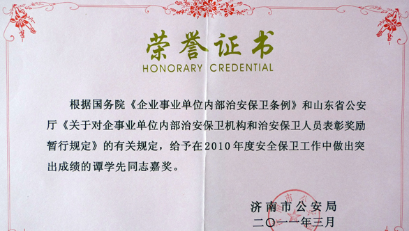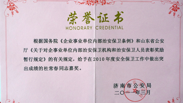 2010年度,永利官网保卫处在学校党委和行政的正确领导下,在市公安局经文保支队的具体指导下,在全校各部门的积极配合下,在全体师生员工的共同参与下,紧紧围绕学校中心工作,创新工作,顽强拼搏,圆满完成了各项治安安全保卫工作任务,为广大师生员工创造了平安和谐的工作、学习和生活环境。 为表彰永利官网保卫处在治安安全保卫工作中取得的优异成绩,2011年1月济南市公安局授予永利官网保卫处“2010年度济南市经文保系统治安保卫机构集体嘉奖”荣誉称号;授予谭学先同志、杜长春同志 “2010年度济南市经文保系统治安保卫机构个人嘉奖”荣誉称号。
