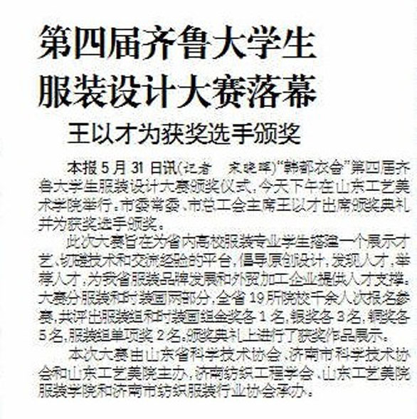 5月31日,“韩都衣舍”第四届齐鲁大学生服装设计大赛颁奖仪式在永利官网数字演播大厅隆重举行,作为山东文化生活中的一项盛会,颁奖仪式受到了各大媒体的广泛关注。 山东电视台、山东人民广播电台、山东教育电视台、济南电视台、中国文化报、中国教育报、大众日报、齐鲁晚报、生活日报、山东商报、山东青年报、山东侨报、济南日报、济南时报、都市女报、齐鲁画报、城色、中新网、中国网、山东新闻网、大众网、齐鲁网、舜网等等二十余家媒体对颁奖仪式做了现场报道。