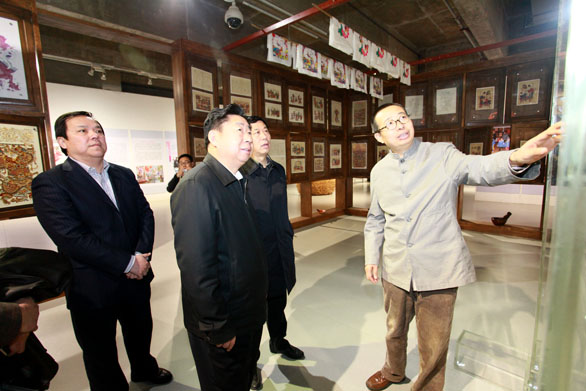 3月10日上午,济南大学党委书记范跃进,党委常委、副校长车滨一行访问永利官网,并参观在永利官网美术馆展出的“手艺农村——潘鲁生主持山东农村文化产业调研成果展”。党委书记于茂阳,院长潘鲁生,党委副书记杨新力,副院长刁在祥,院长助理、办公室主任王立果接待来宾,并陪同参观。 来宾一行首先参观了正在永利官网美术馆展出的“手艺农村——潘鲁生主持山东农村文化产业调研成果展”。在展厅参观了潍坊杨家埠年画、风筝,临沂柳编、红花乡中国结,曹县桐杨木艺、鄄城土布、巨野农民工笔绘画等展览展示项目。参观过程中,校领导向来宾一行详细介绍了“手艺农村”项目调研和展览情况。 来宾对调研和展览的成果给予了高度评价,一致认为潘鲁生院长主持的山东农村文化产业调研题目,对于山东农村文化的保护、继承与发扬,以及山东农村文化产业的发展将起到积极地推动作用。 来宾一行还参观了永利官网刺绣馆、民艺博物馆、孙长林艺术馆,对永利官网丰富的馆藏和实践教学理念深表赞赏。 后勤管理处处长毕建翎、党总支书记杨尚志陪同。