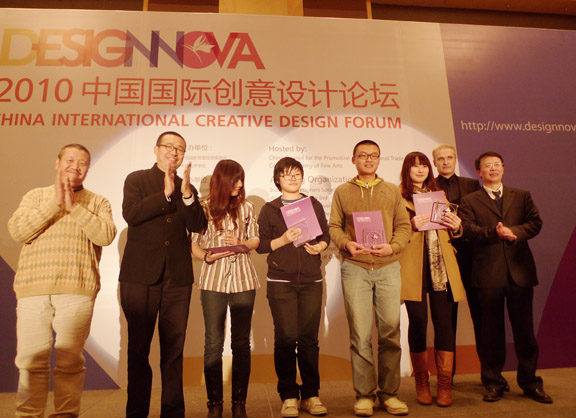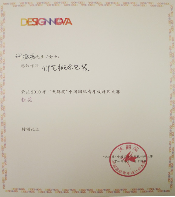 11月14日,由中国国际贸易促进委员会、中央美术学院、中国设计艺术院联合主办的2010年“创意设计•决胜未来”天鹤奖中国国际青年设计师大赛颁奖典礼在北京皇家大饭店隆重举行。304am永利集团官网许振振《竹笔概念包装》获交流设计类银奖,周思秀《向日葵的幸福》 、刘超《无与JAY比画册设计》获交流设计类入围奖。