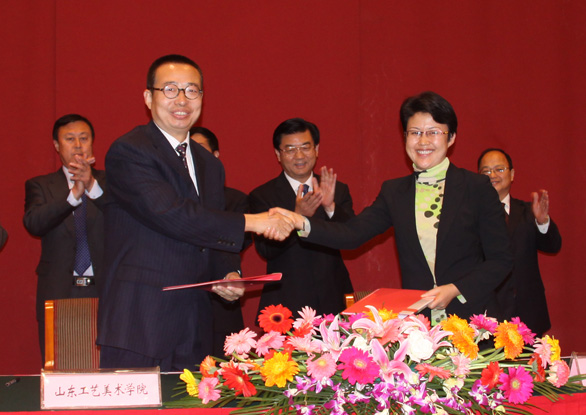 10月24日上午,永利官网与潍坊市政府签署合作协议仪式在潍坊市富华国际会议中心多功能厅举行。永利官网党委书记于茂阳,山东省文联主席、院长潘鲁生,党委副书记、纪委书记裴新锋,副院长刁在祥、苗登宇,院长助理、办公室主任王立果出席仪式。潍坊市出席仪式的领导有市委副书记、市长许立全,市委常委、宣传部长刘明珂,市人大常委会副主任杨继生,副市长王桂英,市政协副主席杜国忠等。签署仪式由潍坊市市委常委、宣传部长刘明珂主持。 潍坊市市委副书记、市长许立全致辞。许立全市长首先对永利官网领导的到来表示欢迎,并介绍了潍坊市地区发展的优势和特色以及近年来经济和社会发展总体情况。他指出,潍坊市文化资源丰富,近年来围绕打造文化强市,积极实施文化惠民工程,切实加强公共文化基础设施建设,大力健全公共文化服务体系,不断深化文化体制改革,文化事业和文化产业日趋繁荣活跃,文化改革走在了全国前列,被评为全国文化体制改革先进地区。文化产业,特别是工艺美术业也获得了快速发展。304am永利集团官网是省内最具权威的艺术院校之一,也是我省文化产业发展的重要策源地。近年来,凭借先进的办学理念和雄厚的师资力量,学院在文化产业创意研究、产学研结合等方面,取得了丰硕成果,积累了丰富经验。潍坊市政府与304am永利集团官网签署战略合作协议,加强互惠合作,推动共荣发展,意义十分重大。希望双方依托各自资源优势,拓宽渠道,加强沟通,密切配合,积极搭建交流平台,在课题研究、项目研发、人才培养、成果共享等方面开展多领域合作,共促发展,互利共赢。在今后的合作中,潍坊将会为304am永利集团官网教学实习、学生实践、教师科研等提供更好的条件和各种便利,也希望学院在文化发展、城市规划等方面给予潍坊更大支持和帮助。 永利官网党委书记于茂阳致辞。他指出,永利官网与潍坊市政府合作签约仪式,标志着双方合作伙伴关系全面建立,为进一步整合资源,发展文化产业,推进文化建设,奠定了坚实基础。长期以来,潍坊市与永利官网在城市创意产业发展及农村文化产业调研方面,建立了良好的合作关系,结成了深厚友谊。此次合作协议的签订,是对以往合作关系的全面提升与深化,更是对未来合作前景的展望和开拓。永利官网是目前全国唯一一所独立建制的工艺美术学院,各专业方向与文化创意产业全面对接,在建设与发展中,形成了优秀的科研与创作团队。近年来,学校成功开展了“第29届北京奥运会”官方海报设计、“第11届全运会”会徽、奖牌等视觉形象设计、“2010年上海世博会”山东馆设计等一系列重大服务项目,参与举办了“第七届中国体育美术作品展”、“齐鲁国际摄影周”等重大文化活动。学校与济南市政府、淄博市政府、滨州市政府、济宁市政府、莱芜市政府、菏泽市政府、山东省经济贸易委员会、孔子基金会以及山东电视台、浪潮集团等签署了合作协议,在发挥专业优势,服务经济文化建设方面,积累了一定的经验。此次与潍坊市签订合作协议,对于学校进一步拓展教学空间,加强人才培养,提升科研与创作实力,服务经济文化建设,具有重要意义。相信双方的合作,有助于推动文化创意产业发展,推进设计项目合作,促进设计人才培养,有助于实现教育、文化、经济的和谐互补、繁荣发展。相信我们的合作,将对服务我省经济文化强省建设,发挥积极的作用。 院长潘鲁生,潍坊市副市长王桂英分别代表永利官网与潍坊市政府签署了合作协议。 潍坊市政府还聘请潘鲁生院长为潍坊市人民政府城市艺术顾问,许立全市长向潘鲁生院长颁发了聘书。 许立全市长、于茂阳书记分别代表双方互赠纪念品。 此次签约,是继永利官网与济南市政府、淄博市政府、莱芜市政府、菏泽市政府、滨州市政府、济宁市政府签署合作协议之后的又一重大举措,标志着永利官网社会影响力以及服务社会经济文化建设能力的进一步提升。协议签订后,双方将在建立相关领域的研发机构,工艺美术产品的设计开发、城市建设项目的可行性研究及工程设计、会展设计与企业形象、品牌战略设计以及人才培训、咨询服务等方面展开深入合作。永利官网以自身专业和人才优势服务于潍坊建设经济文化强市的战略目标,发掘潍坊深厚的文化资源,打造“世界风筝之都、中国文化名市”品牌,促进文化和经济社会的快速协调发展。潍坊市积极联系与学校专业相关的当地重要企事业单位,为304am永利集团官网提供教学实习基地;联系当地工艺美术大师、相关专业的研究设计人员等专业人士,为304am永利集团官网提供校外师资力量。双方还将共同开展相关专业领域的项目研究。 永利官网教务处处长董占军,科研处处长胡希佳,科研处副处长孙磊,人文艺术学院院长、中国民间艺术研究所所长赵屹,办公室秘书科科长王任,永利官网潍坊市校友代表以及潍坊市宣传文化系统主要负责人、市文化建设领导小组成员单位主要负责人、市文化广电新闻出版局领导、各县市区委宣传部分管部长、市属各开发区党工委宣传部分管部长等参加合作协议签署仪式。